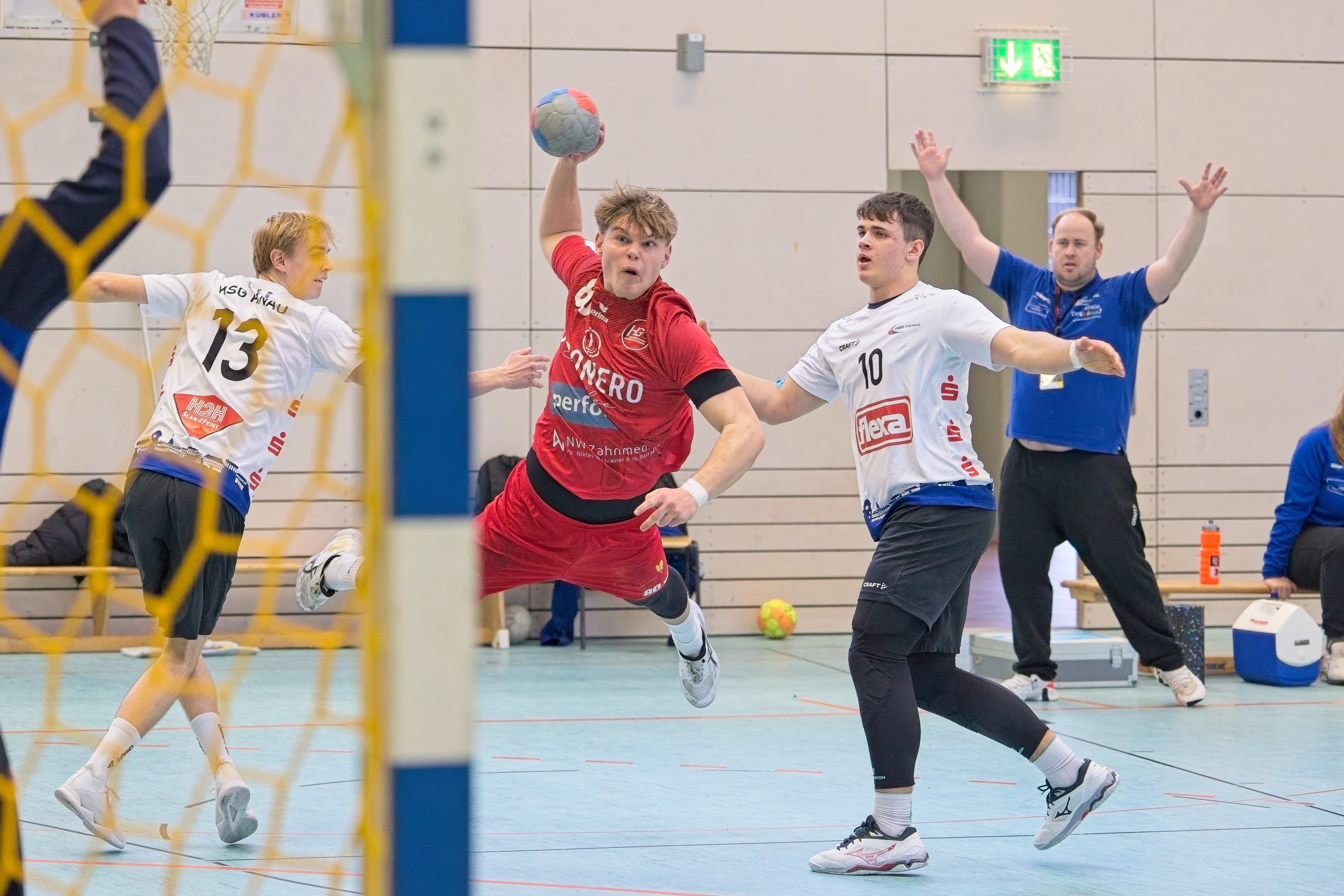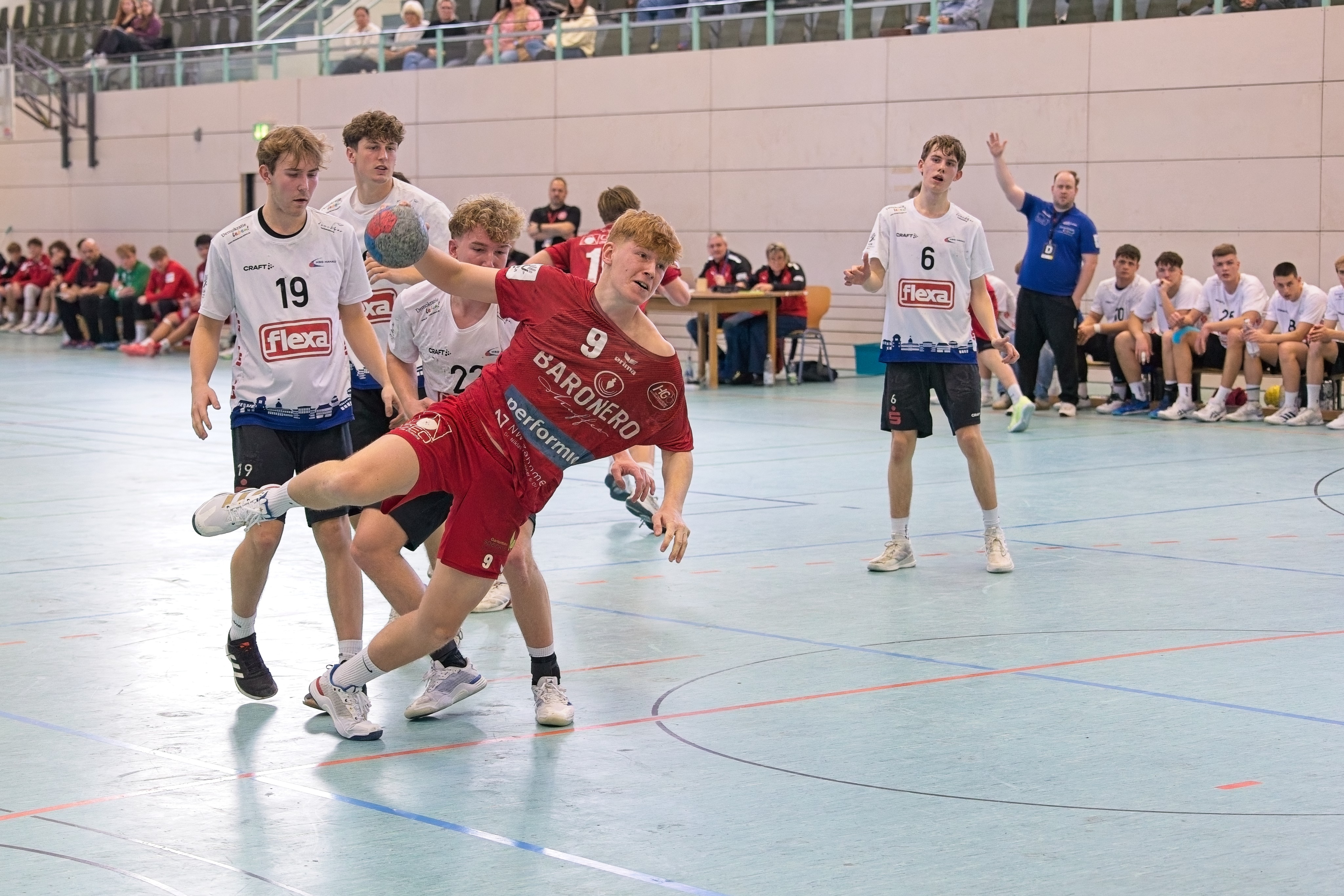 Dabei verrichteten die Gastgeber teilweise, besonders zum Beginn beider Halbzeiten, ihren Job durchaus in der geforderten Weise. Schon der erste HSG-Angriff rannte sich im Zeitspiel fest, der finale Wurf wurde geblockt. Schnell wurde auf 3:0 gestellt, wobei noch zwei Konter liegengelassen wurden. Die Richtung, welche das Match nehmen sollte, schien klar vorgezeichnet. Die HG war ihren Gästen, die in der Deckung mit zwei offensiven Halben operierten, haushoch überlegen (8:2/11. und 11:4/13.). Für Torhüter Joshua Wolf gab es zunächst kaum Arbeit.