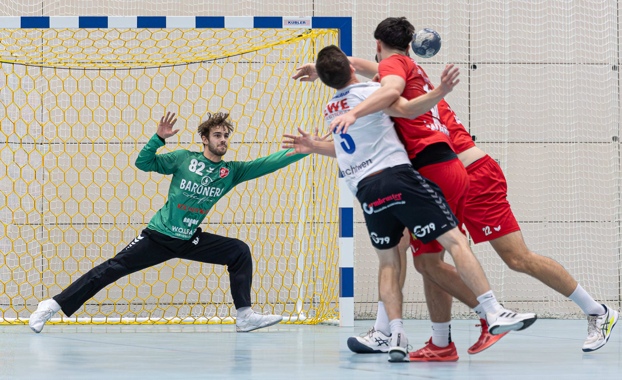 Ein Doppelschlag von David Huljak brachte dann für eine gewisse Weile die letzte Annäherung (16:14/34.). Ständig lobte der als Co-Trainer eingesetzte verletzte Lars Fichtner die aufmerksame Deckungsarbeit. Aber irgendwie blieb der Ball permanent in TSV-Besitz, sei es wegen Seitenaus, Abprallern oder Fouls und irgendwann landete trotz einiger Paraden – jetzt von Jeremie Meyer im Tor (Bild oben) – in den von HG-Sicht falschen Händen und dafür im eigenen Netz.
